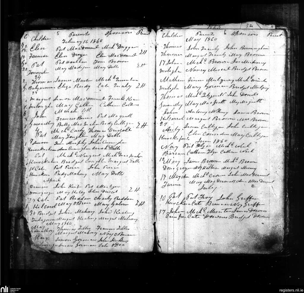 Knockera; County of Clare; Diocese of Killaloe. Baptisms, Feb. 1860 to July 1860