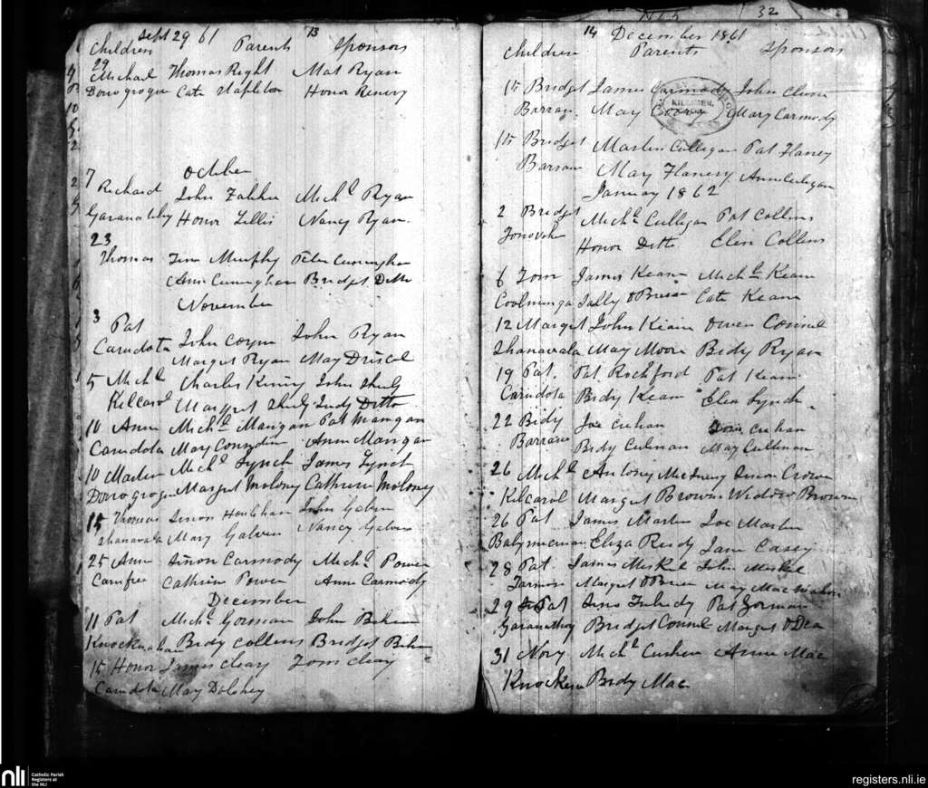 Knockera; County of Clare; Diocese of Killaloe. Baptisms, Sep. 1861 to Jan. 1862