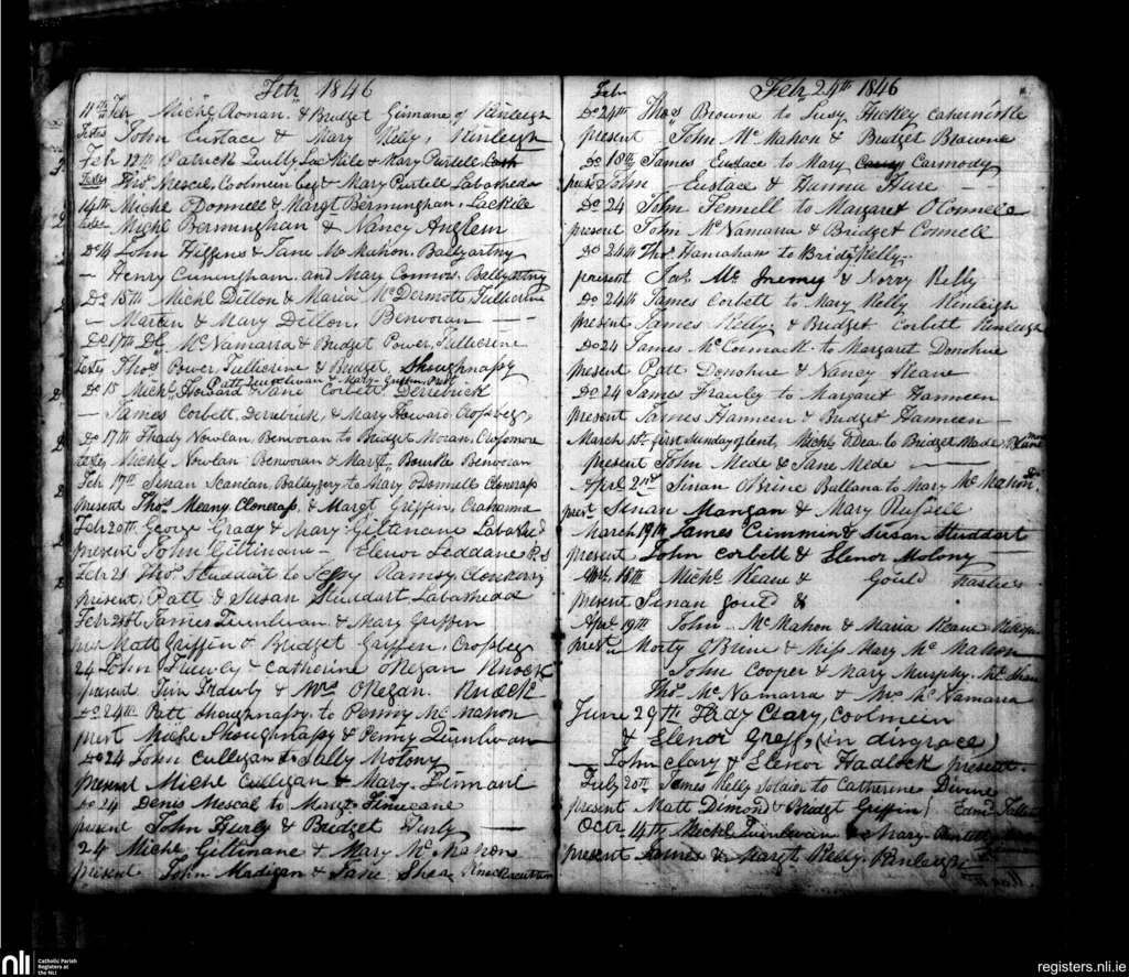 Kilmurry McMahon; County of Clare; Diocese of Killaloe. Marriages, Feb. 1846 to Oct. 1846