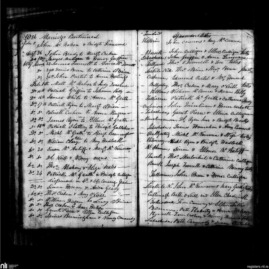 Kilmurry McMahon; County of Clare; Diocese of Killaloe. Marriages, Feb. 1856 to Feb. 1857