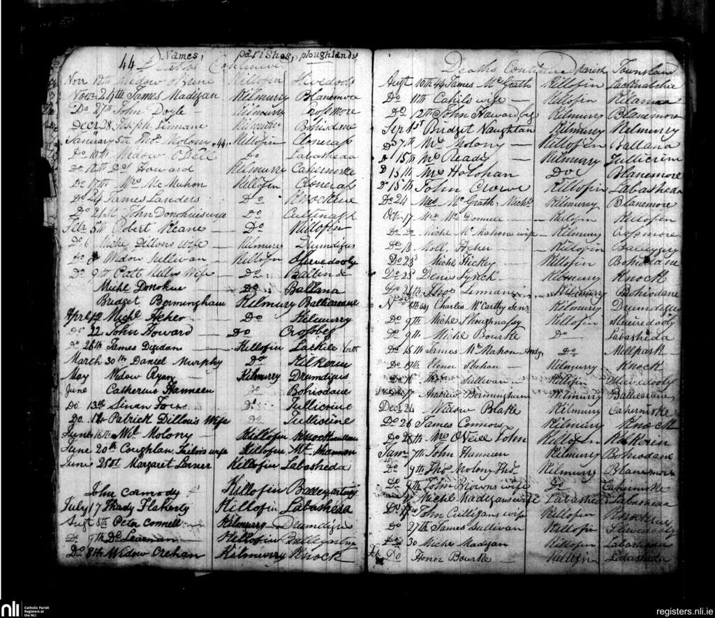 Kilmurry McMahon; County of Clare; Diocese of Killaloe. Deaths, Nov. 1843 to Feb. 1845
