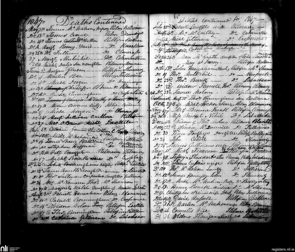 Kilmurry McMahon; County of Clare; Diocese of Killaloe. Deaths, May 1847 to Jan. 1848