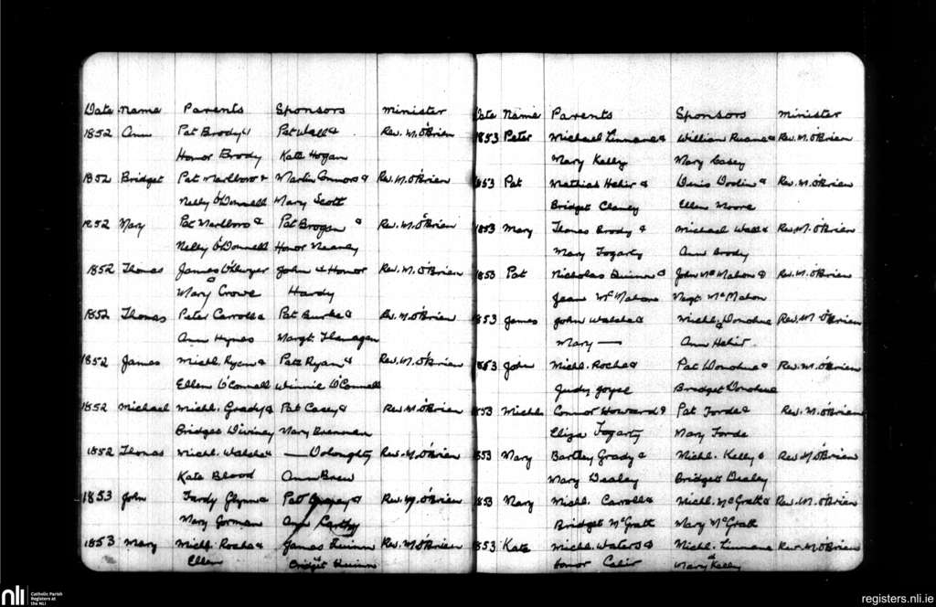 Killkeady; County of Clare; Diocese of Killaloe. Baptisms, Translation missing: en.month_abv_0 1852 to Translation missing: en.month_abv_0 1853