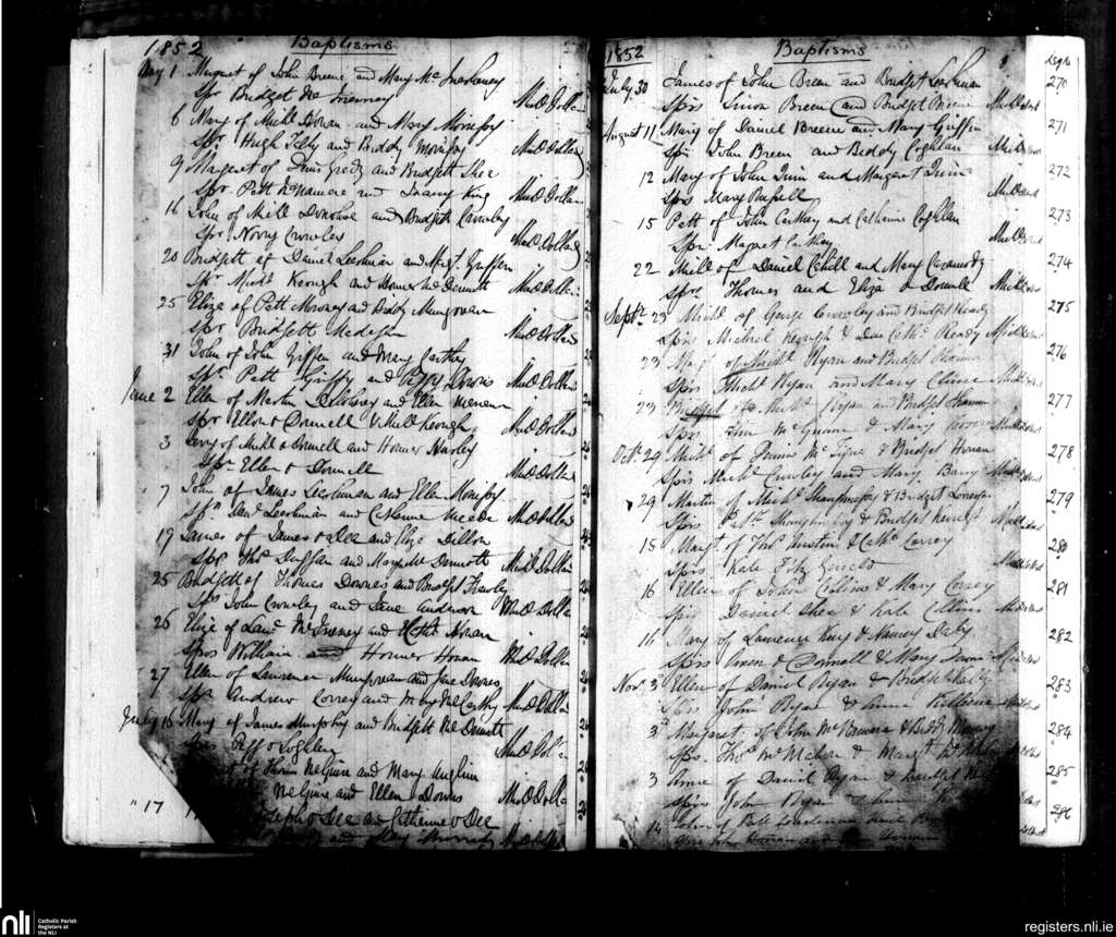 Kilmihil; County of Clare; Diocese of Killaloe. Baptisms, May 1852 to Nov. 1852