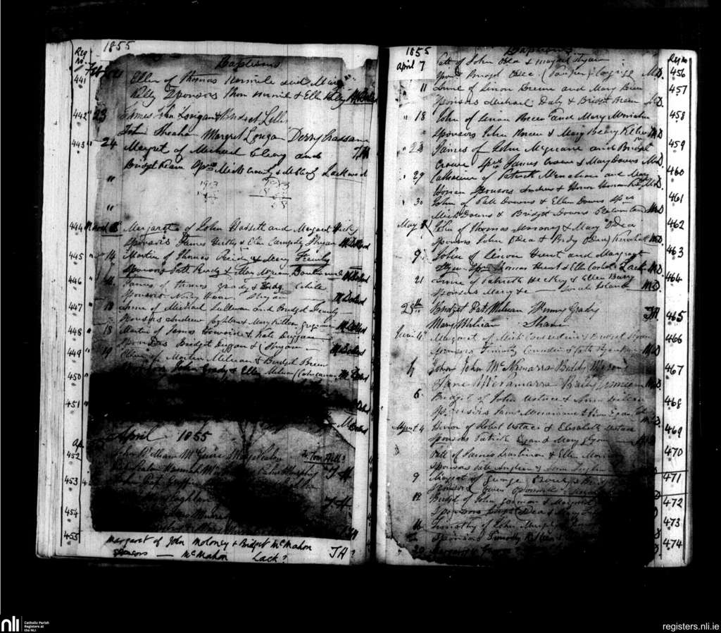 Kilmihil; County of Clare; Diocese of Killaloe. Baptisms, Feb. 1855 to Aug. 1855
