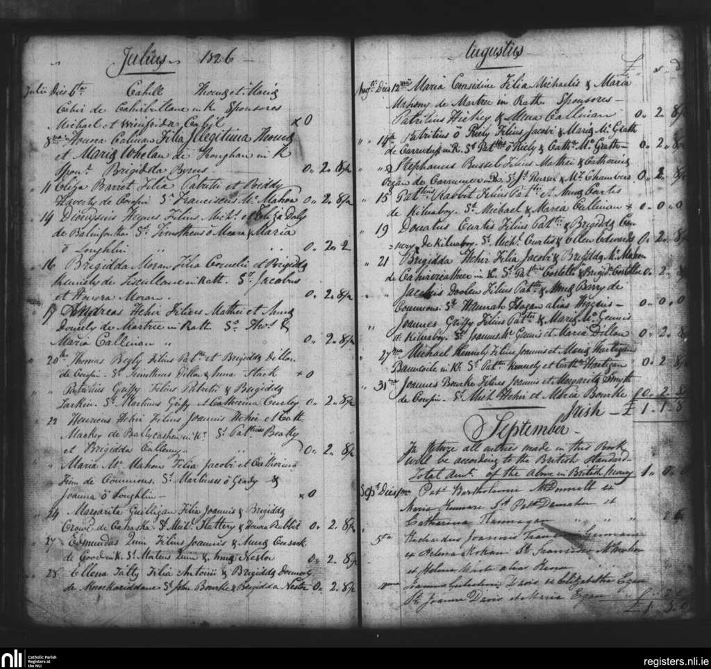 Rath; County of Clare; Diocese of Killaloe. Baptisms, July 1826 to Sep. 1826