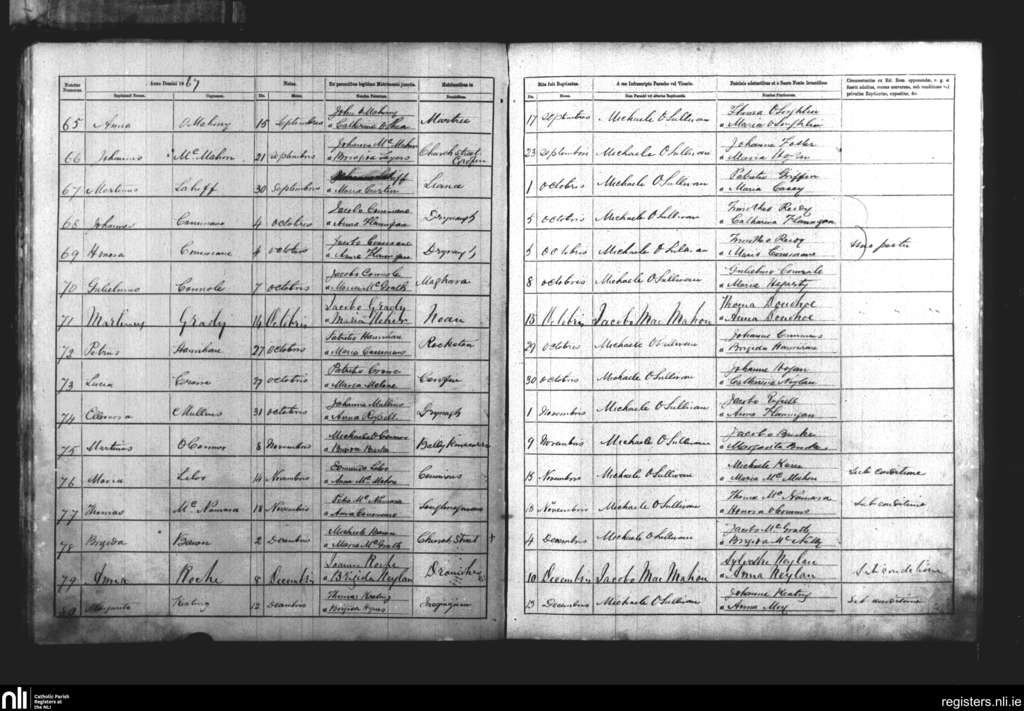 Rath; County of Clare; Diocese of Killaloe. Baptisms, Sep. 1867 to Dec. 1867
