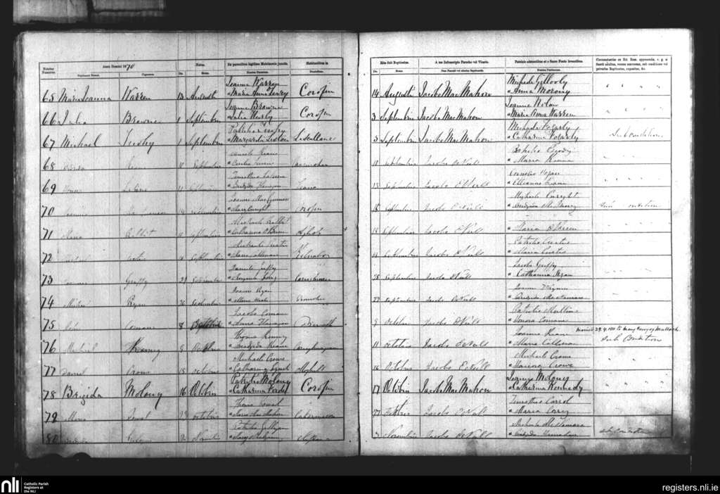 Rath; County of Clare; Diocese of Killaloe. Baptisms, Aug. 1870 to Nov. 1870
