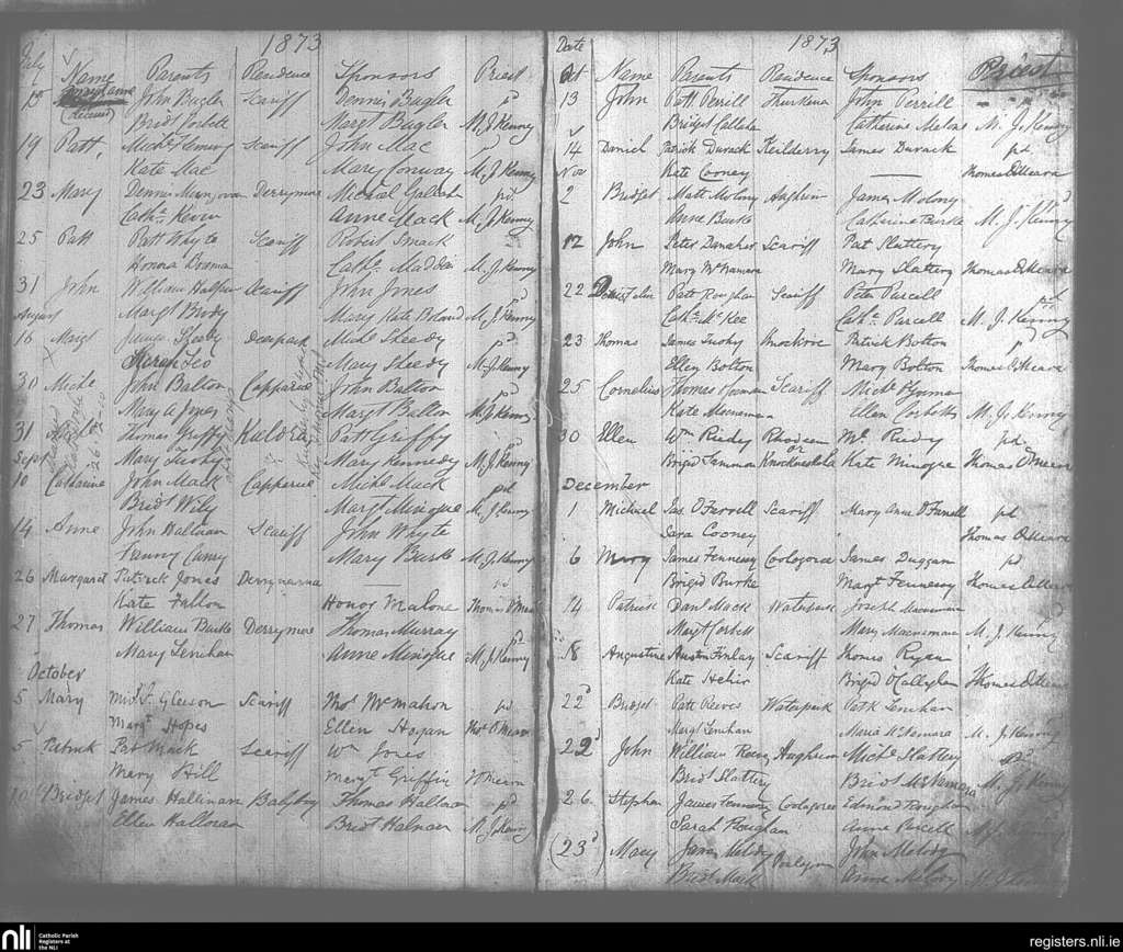 Scarriff; County of Clare; Diocese of Killaloe. Baptisms, Marriages, July 1873 to Dec. 1910