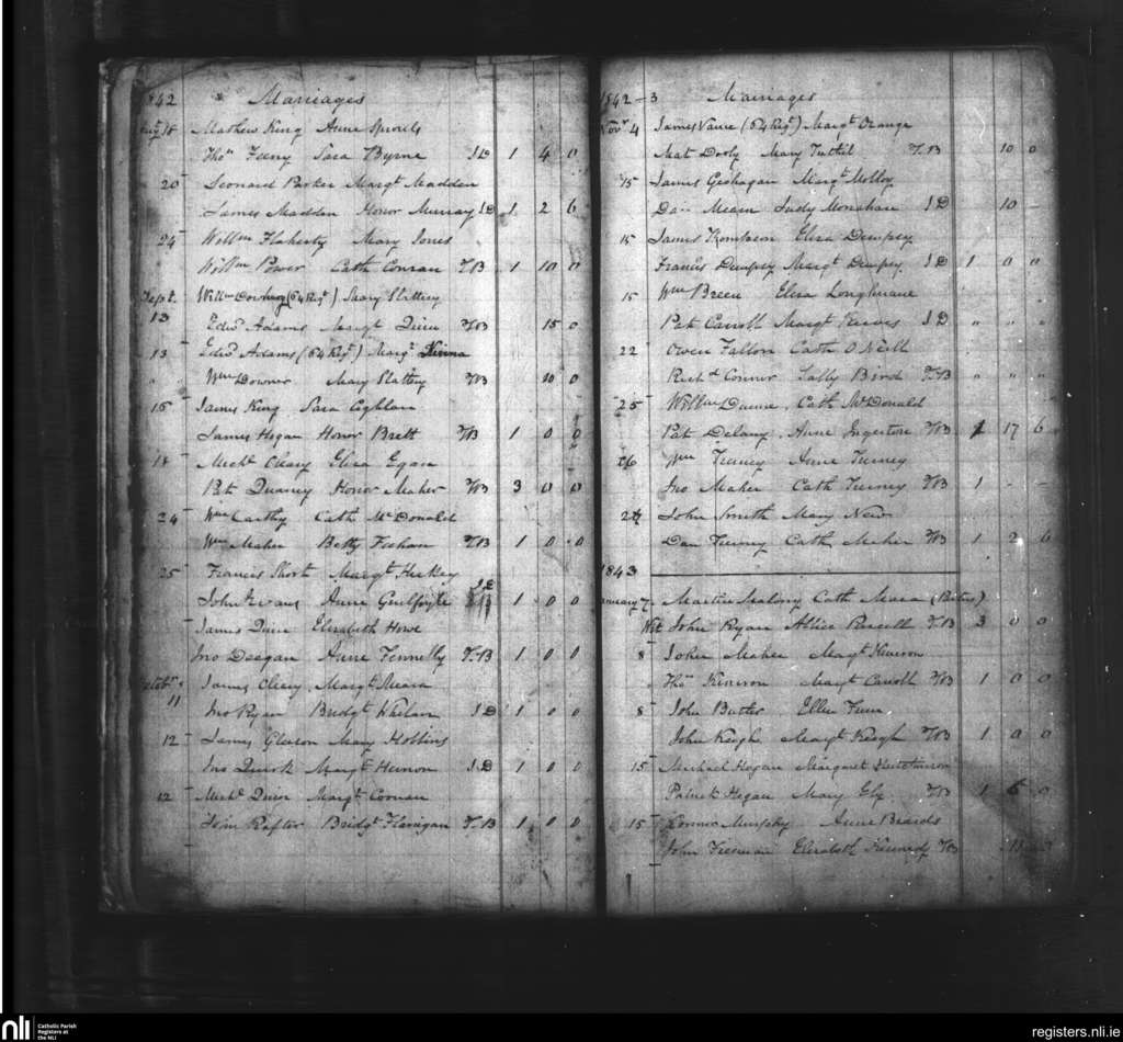 Roscrea; County of Tipperary, Laois, Offaly; Diocese of Killaloe. Marriages, Aug. 1842 to Jan. 1843