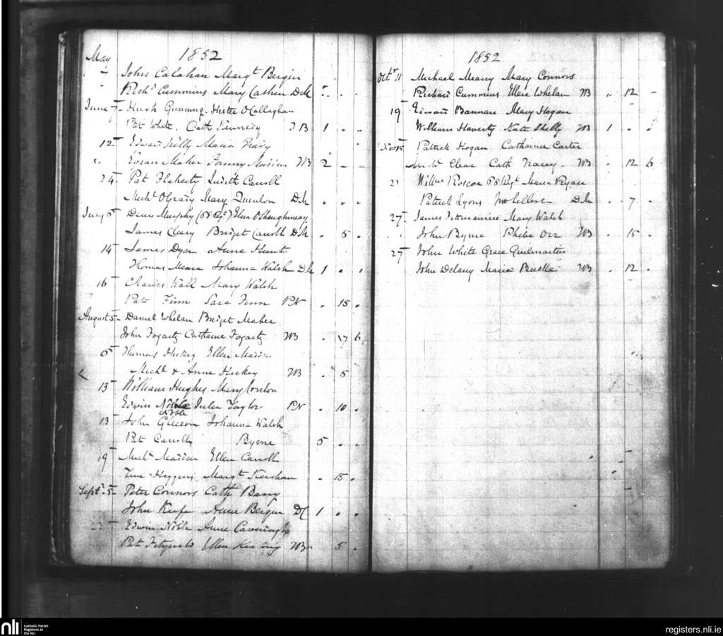 Roscrea; County of Tipperary, Laois, Offaly; Diocese of Killaloe. Marriages, May 1852 to Nov. 1852