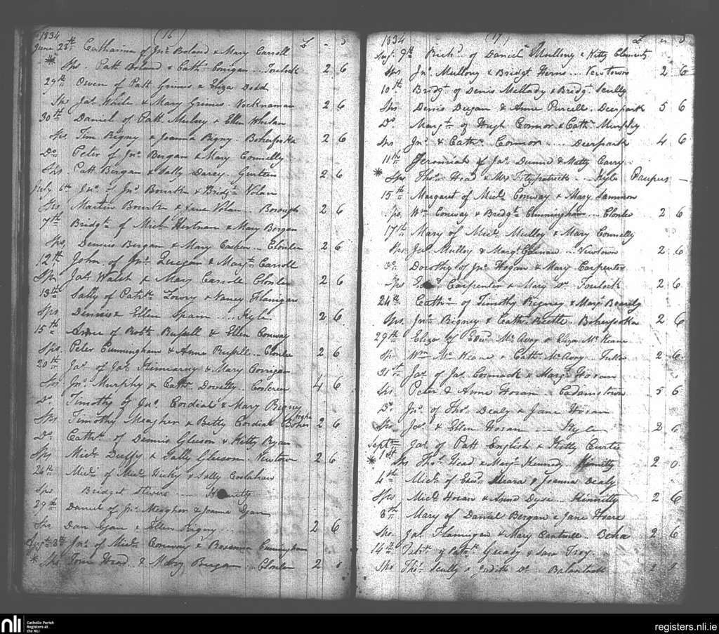 Roscumroe; County of Offaly; Diocese of Killaloe. Baptisms, June 1834 to Sep. 1834
