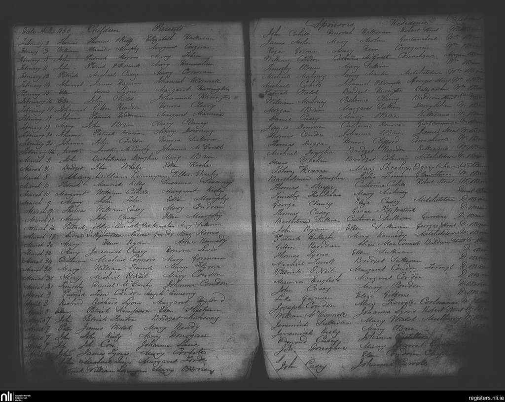 Mitchelstown; County of Cork; Diocese of Cloyne. Baptisms, Jan. 1850 to Apr. 1850