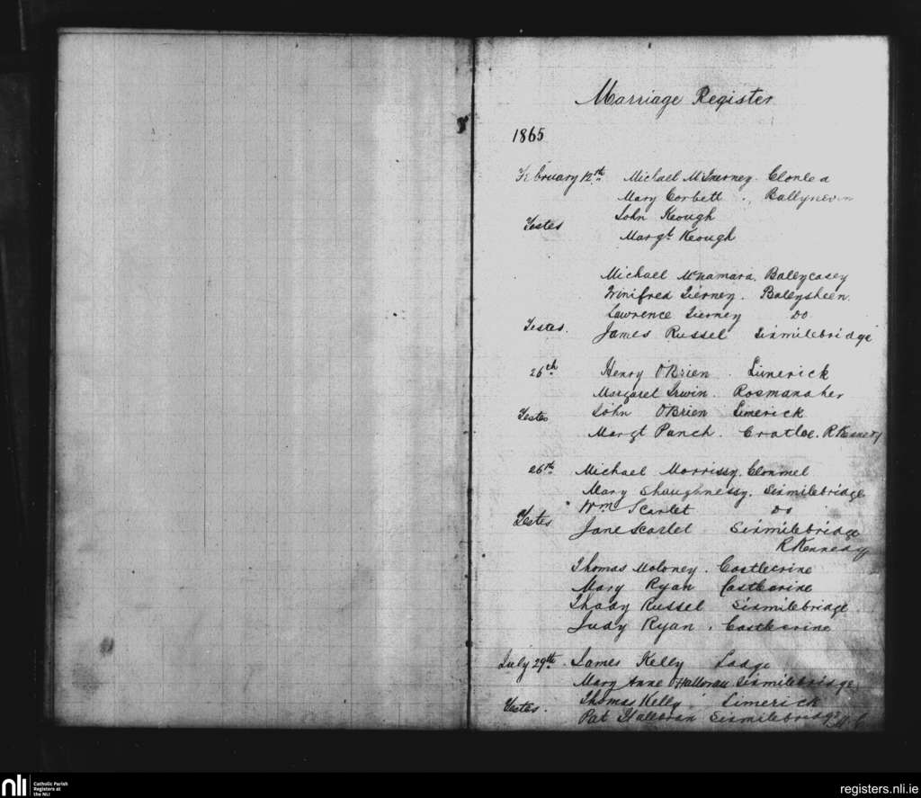Sixmilebridge; County of Clare; Diocese of Killaloe. Marriages, Feb. 1865 to July 1865