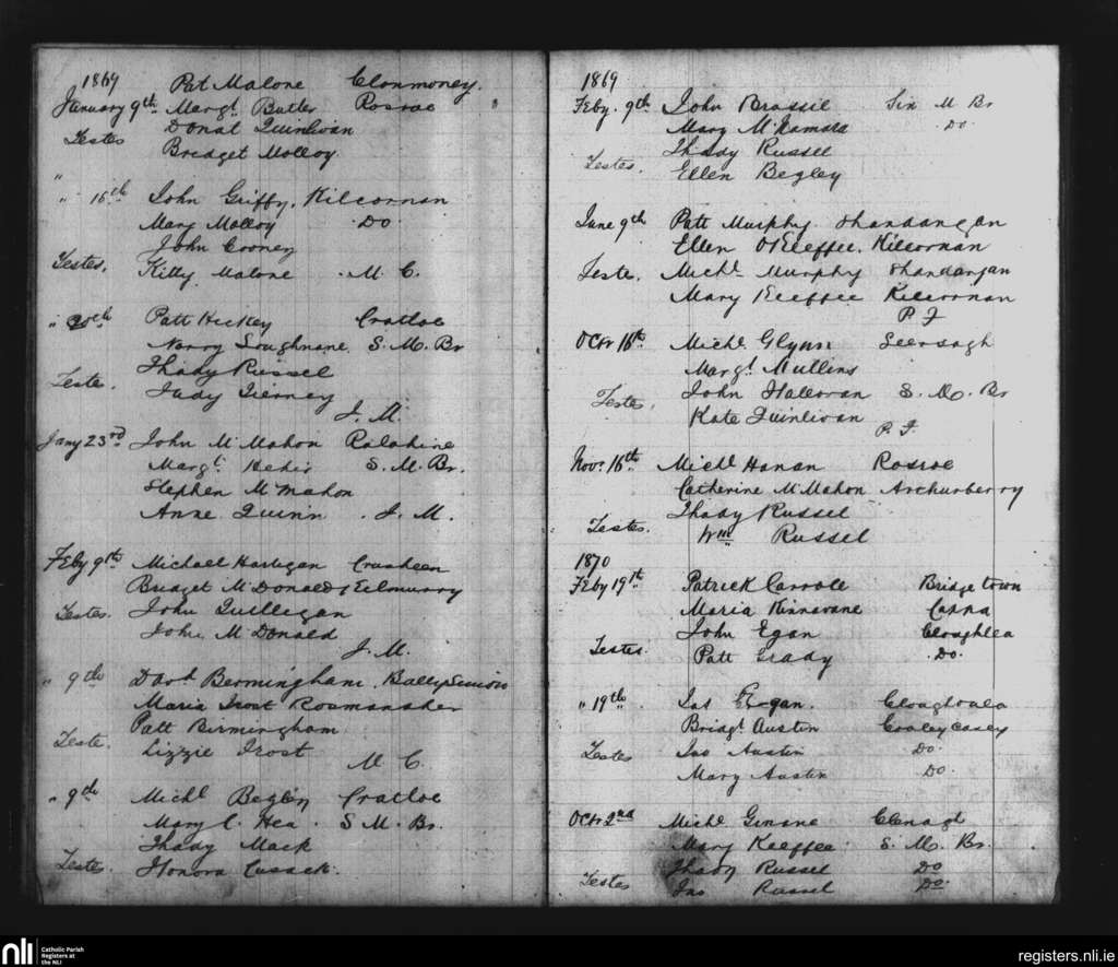 Sixmilebridge; County of Clare; Diocese of Killaloe. Marriages, Jan. 1869 to Oct. 1870