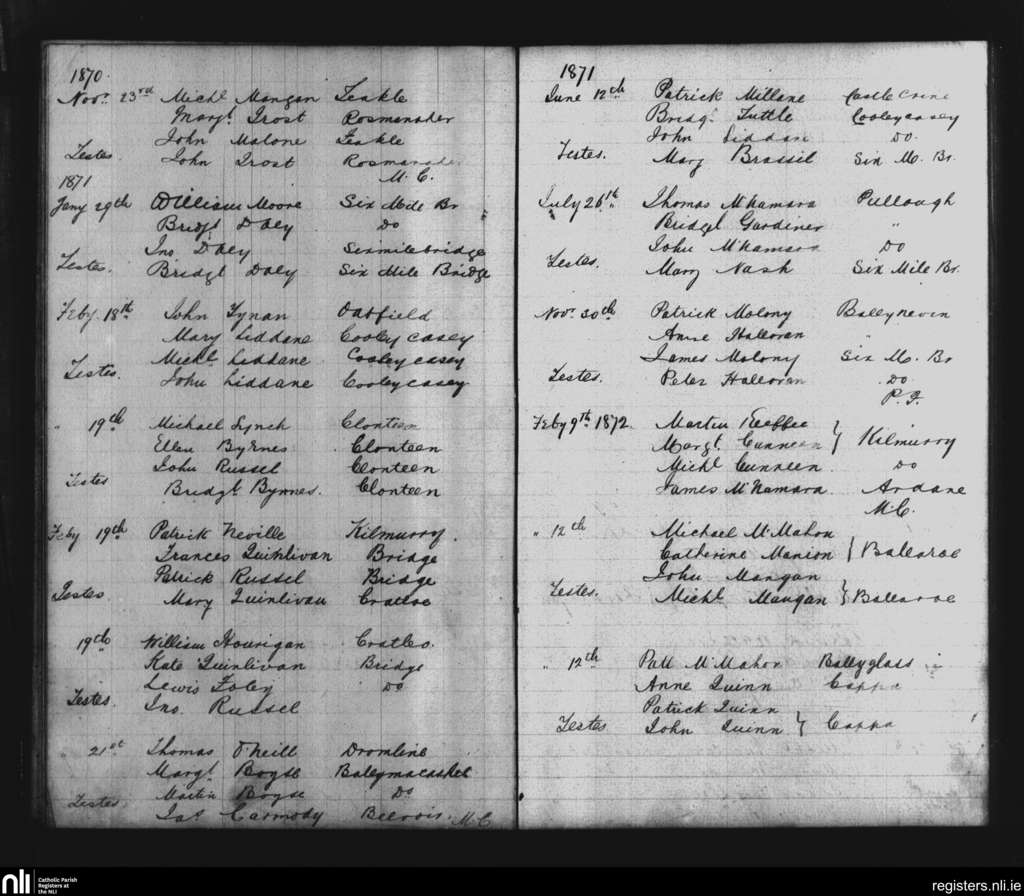 Sixmilebridge; County of Clare; Diocese of Killaloe. Marriages, Nov. 1870 to Feb. 1872