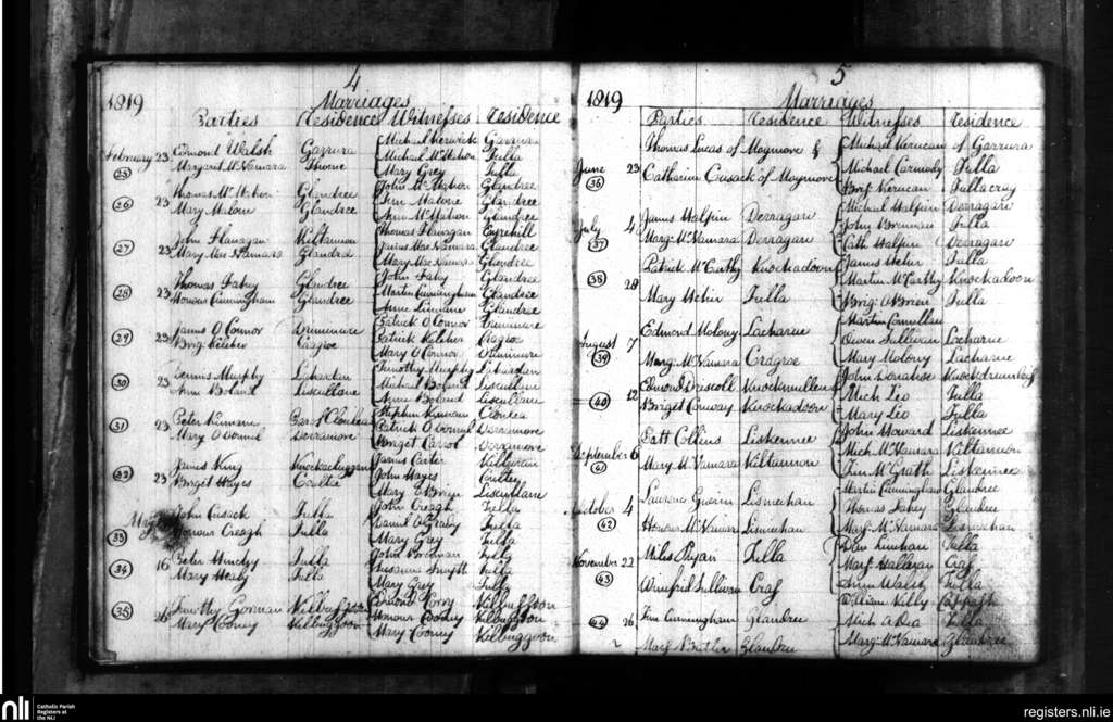 Tulla; County of Clare; Diocese of Killaloe. Marriages, Feb. 1819 to Nov. 1819