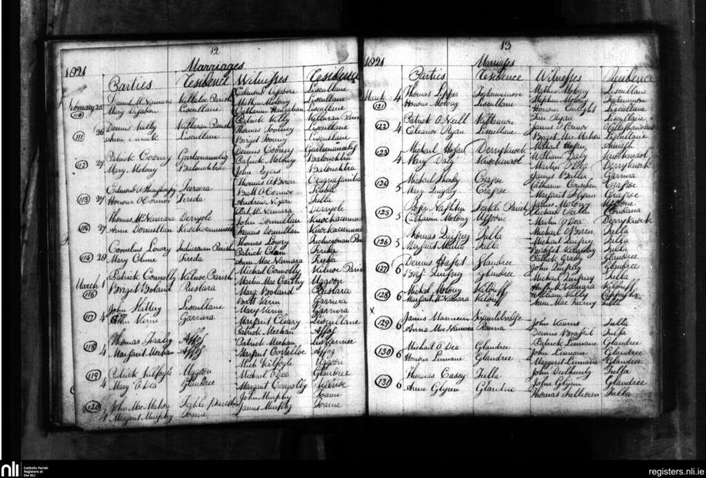 Tulla; County of Clare; Diocese of Killaloe. Marriages, Feb. 1821 to Mar. 1821
