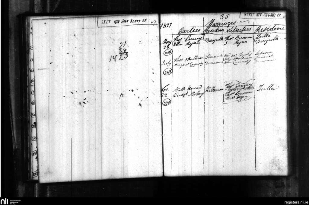Tulla; County of Clare; Diocese of Killaloe. Marriages, May 1827 to Nov. 1827