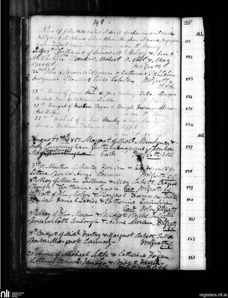 Tulla; County of Clare; Diocese of Killaloe. Baptisms, July 1851 to Aug. 1851