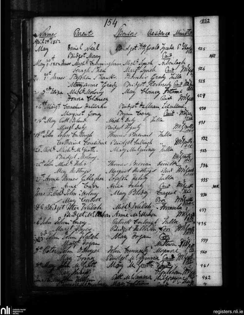 Tulla; County of Clare; Diocese of Killaloe. Baptisms, Apr. 1852 to June 1852