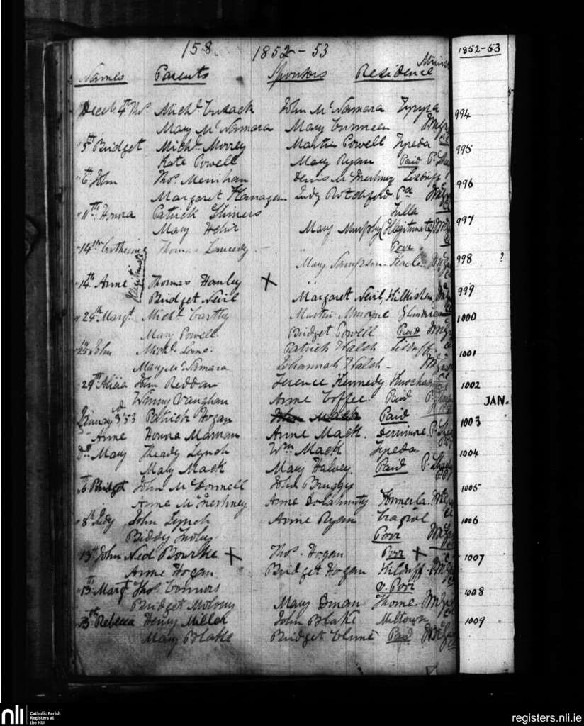 Tulla; County of Clare; Diocese of Killaloe. Baptisms, Dec. 1852 to Jan. 1853