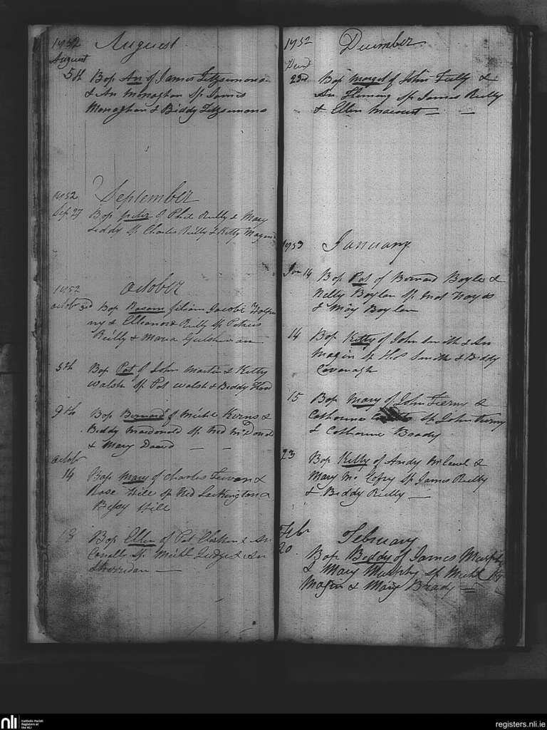 Annagh; County of Cavan; Diocese of Kilmore. Baptisms, Aug. 1852 to Feb. 1853