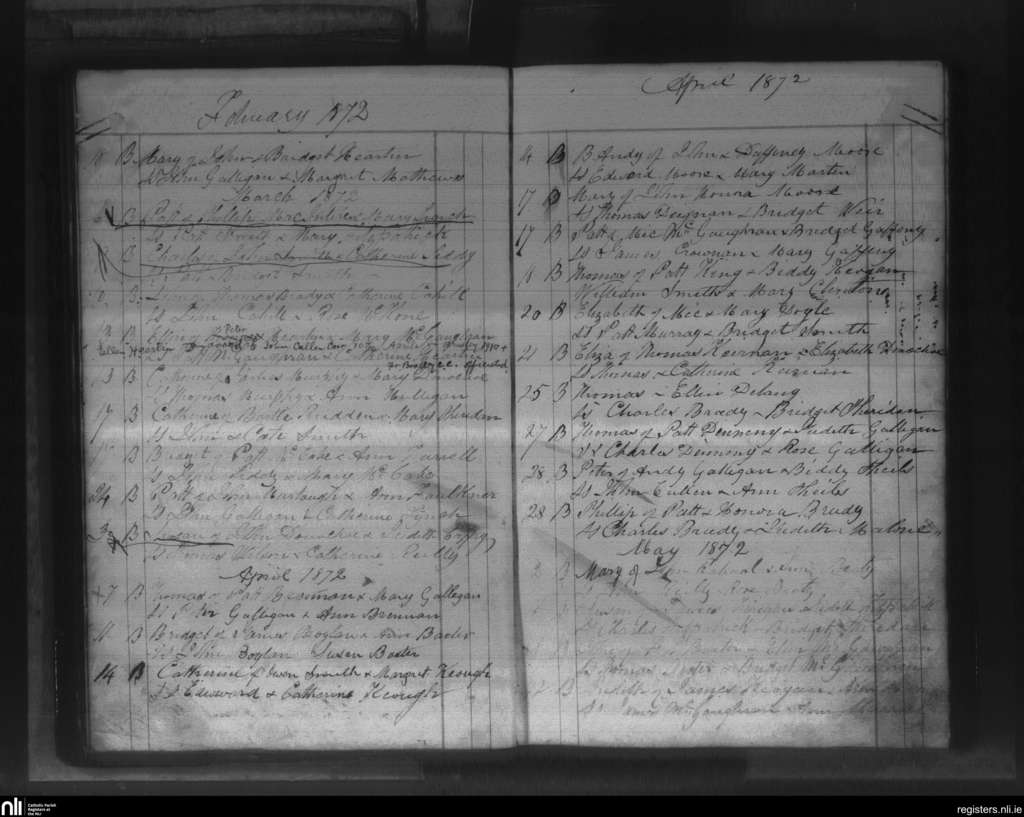 Ballintemple; County of Cavan; Diocese of Kilmore. Baptisms, Feb. 1872 to May 1872