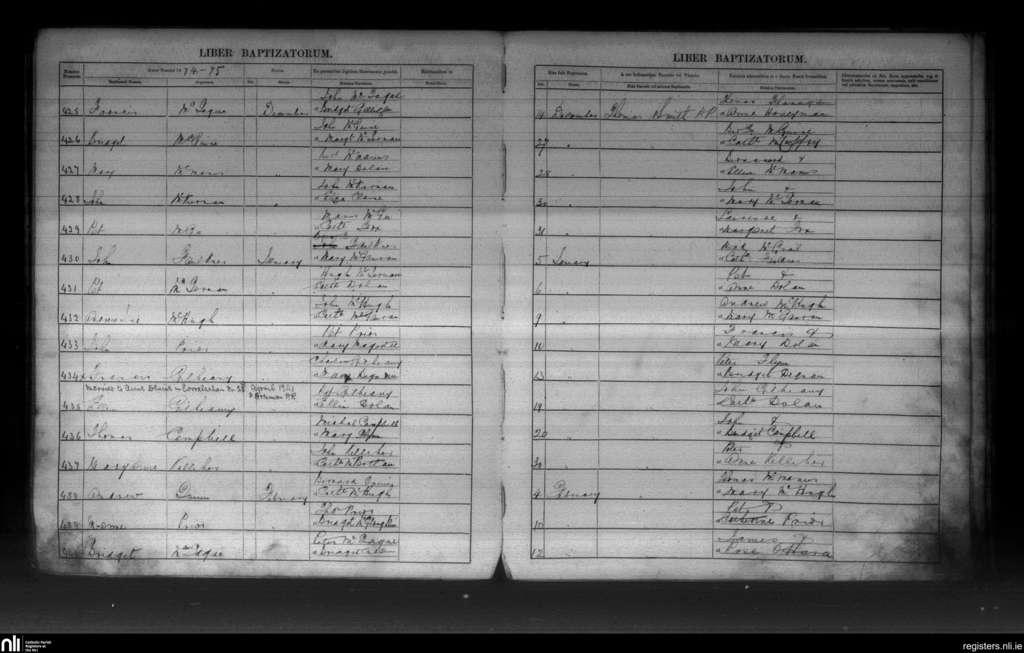 Drumreilly Lower; County of Cavan, Leitrim; Diocese of Kilmore. Baptisms, Dec. 1874 to Feb. 1875