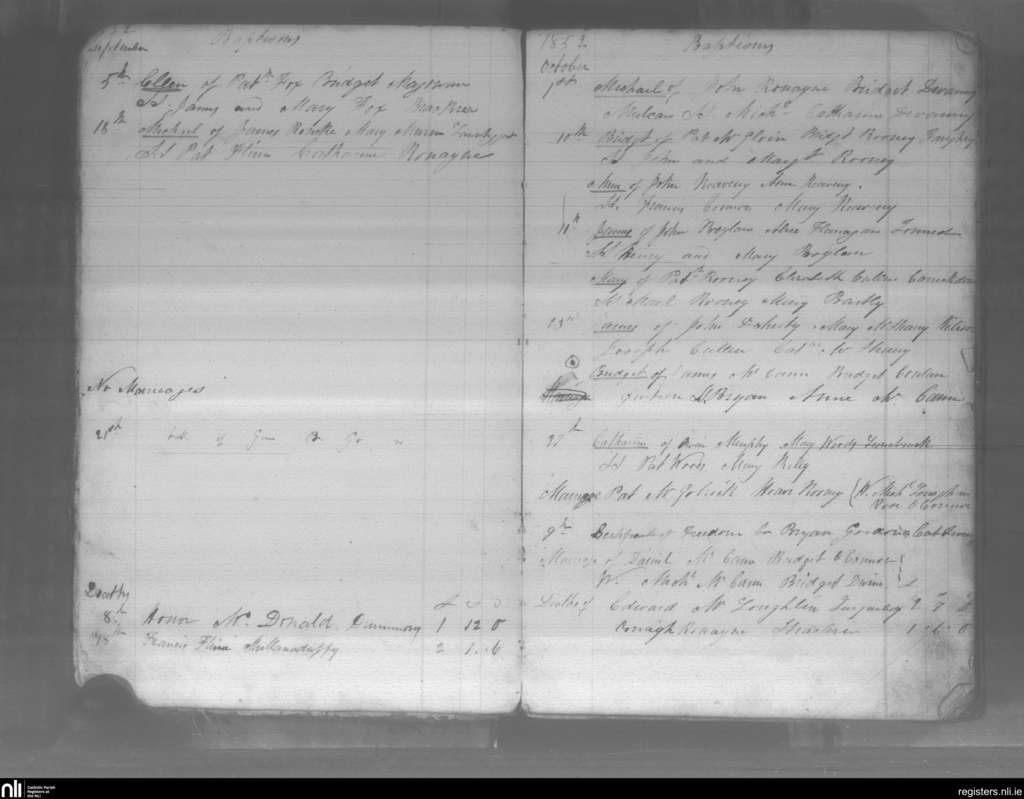Killasnet; County of Leitrim; Diocese of Kilmore. Baptisms, Marriages, Deaths, Sep. 1852 to Oct. 1852