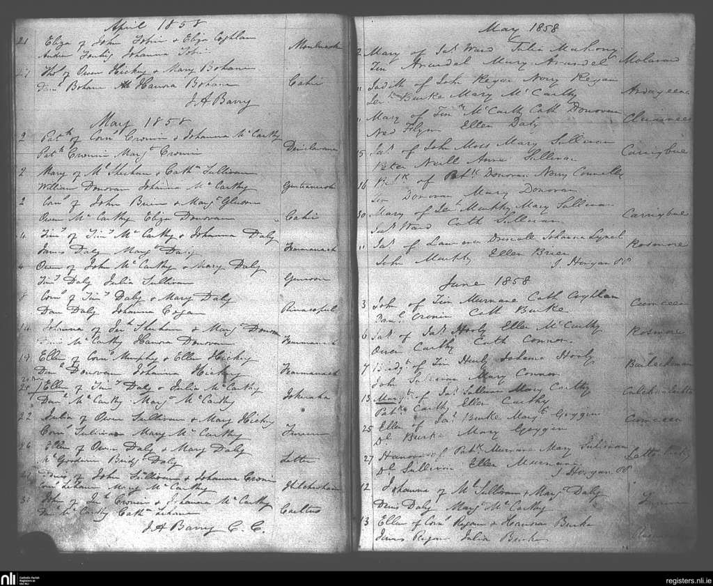 Muintervarra; County of Cork; Diocese of Cork and Ross. Baptisms, Apr. 1858 to June 1858