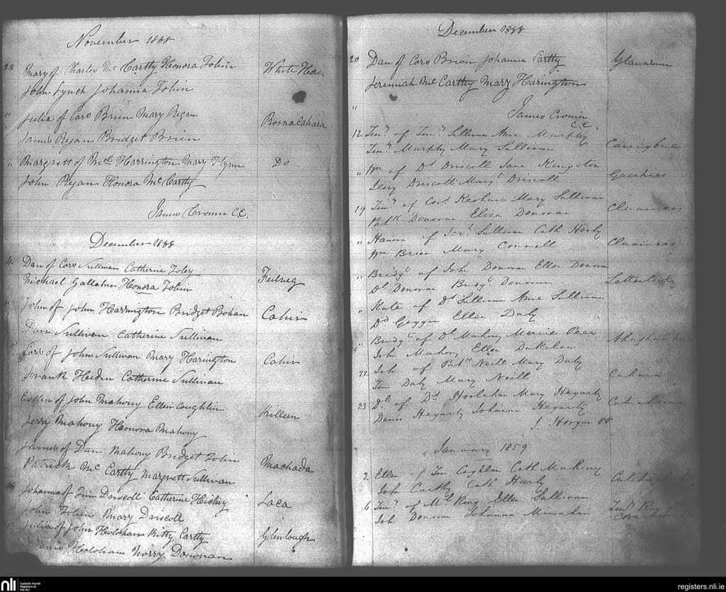 Muintervarra; County of Cork; Diocese of Cork and Ross. Baptisms, Nov. 1858 to Jan. 1859