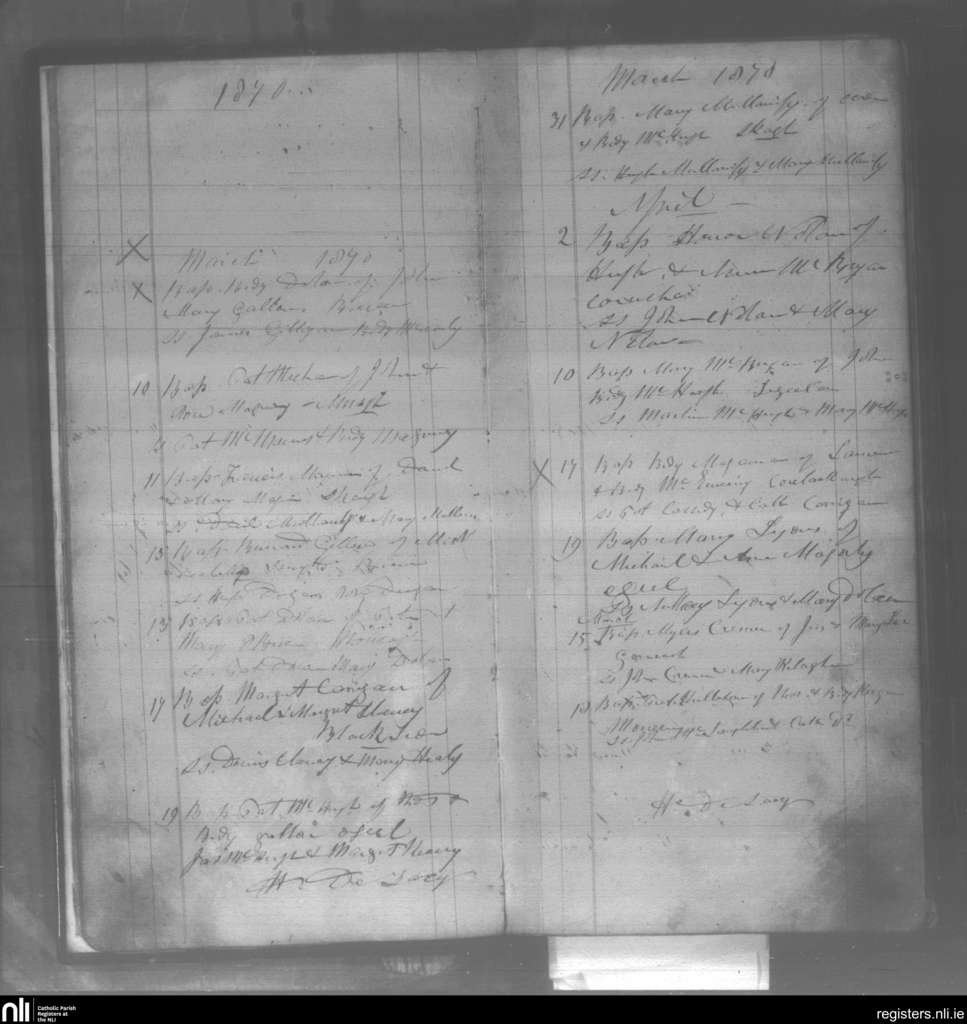 Killinagh; County of Cavan; Diocese of Kilmore. Baptisms, Mar. 1870 to Apr. 1870