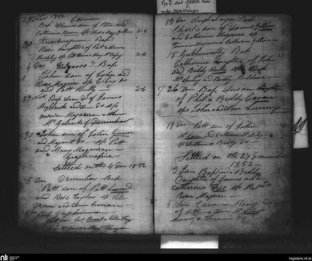 Kinnally; County of Fermanagh, Cavan; Diocese of Kilmore. Baptisms, Nov. 1852 to Jan. 1853