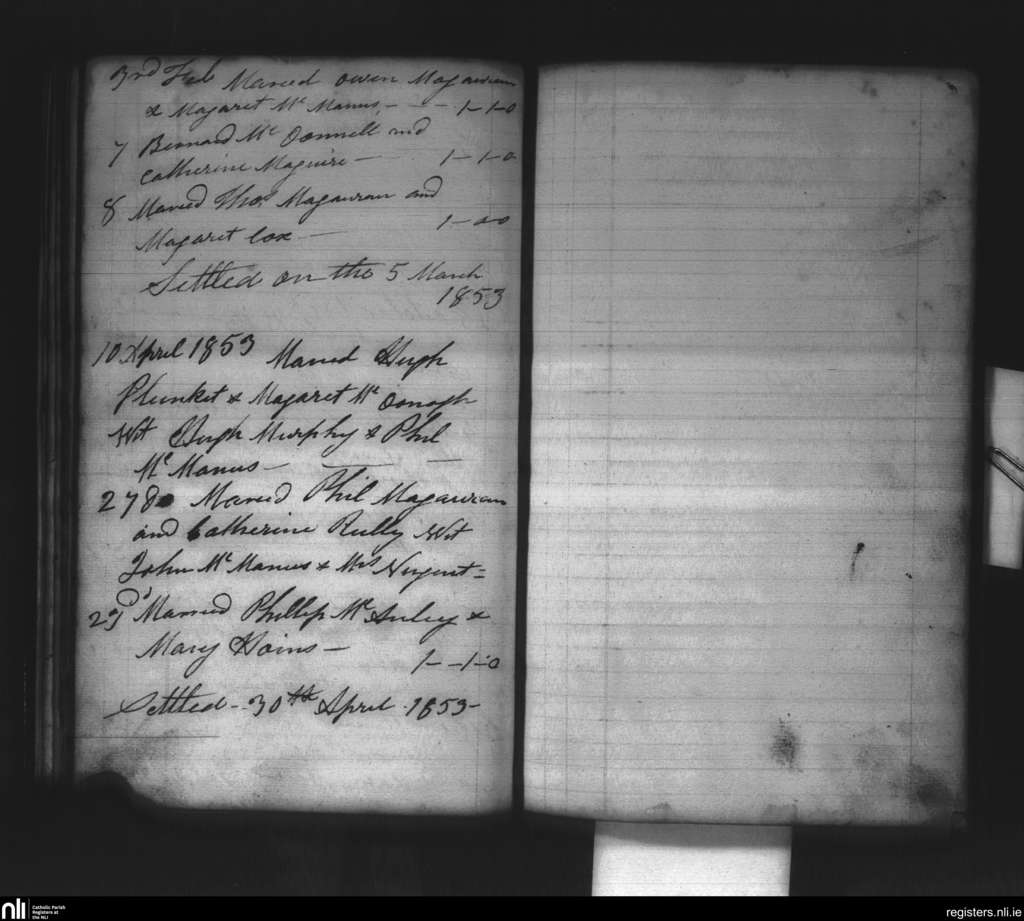 Kinnally; County of Fermanagh, Cavan; Diocese of Kilmore. Marriages, Feb. 1853 to Apr. 1853