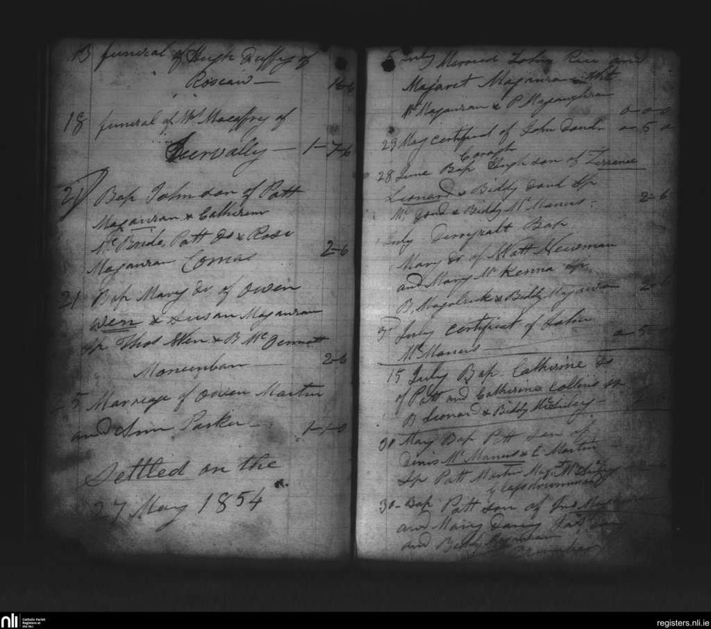 Kinnally; County of Fermanagh, Cavan; Diocese of Kilmore. Baptisms, Marriages, Funerals, May 1854 to July 1854