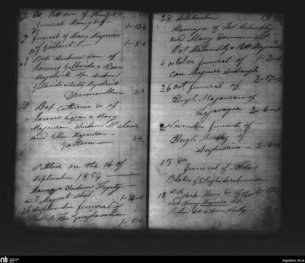 Kinnally; County of Fermanagh, Cavan; Diocese of Kilmore. Baptisms, Marriages, Funerals, Sep. 1854 to Nov. 1854