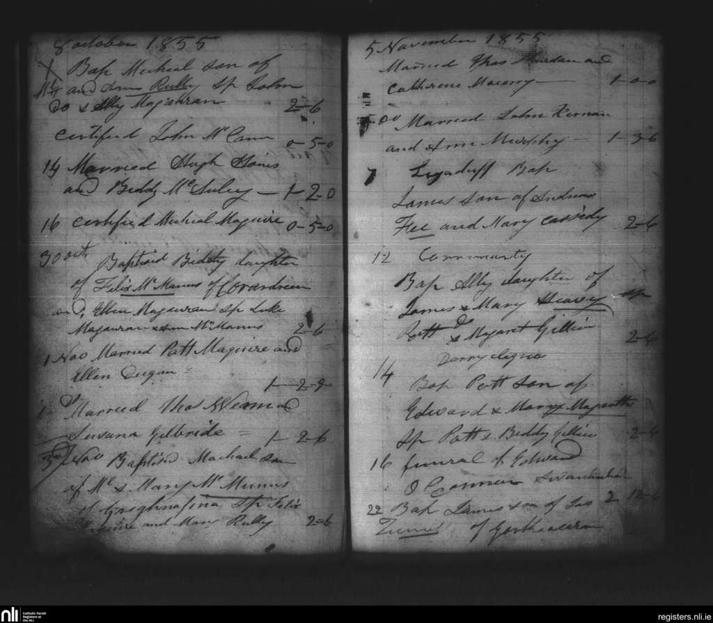 Kinnally; County of Fermanagh, Cavan; Diocese of Kilmore. Baptisms, Marriages, Funerals, Oct. 1855 to Nov. 1855