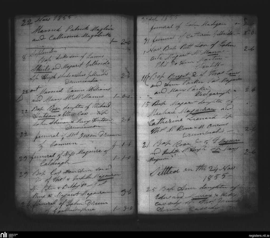 Kinnally; County of Fermanagh, Cavan; Diocese of Kilmore. Baptisms, Marriages, Funerals, Sep. 1855 to Nov. 1855