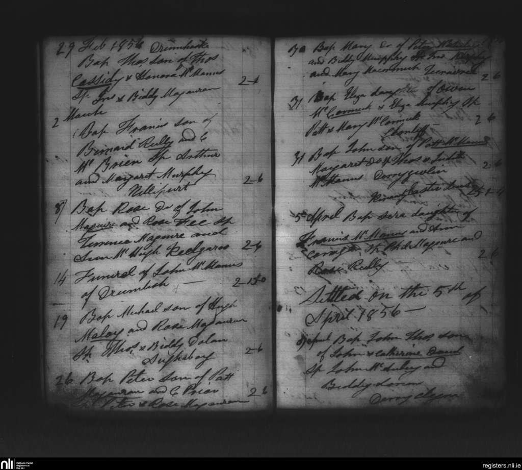 Kinnally; County of Fermanagh, Cavan; Diocese of Kilmore. Baptisms, Funerals, Feb. 1856 to Apr. 1856
