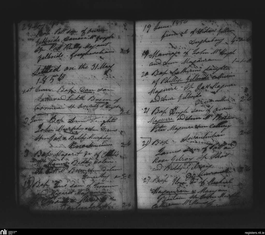 Kinnally; County of Fermanagh, Cavan; Diocese of Kilmore. Baptisms, Marriages, Funerals, May 1856 to June 1856