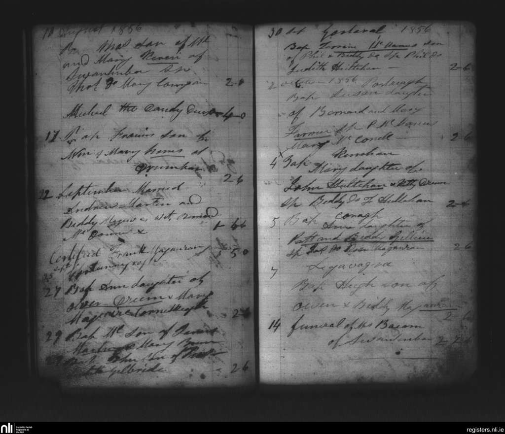 Kinnally; County of Fermanagh, Cavan; Diocese of Kilmore. Baptisms, Marriages, Funerals, Aug. 1856 to Sep. 1856