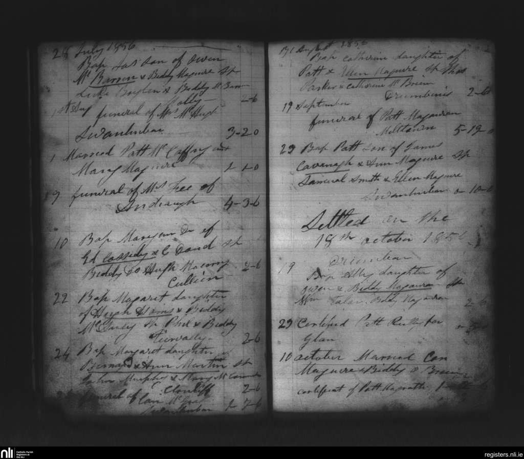 Kinnally; County of Fermanagh, Cavan; Diocese of Kilmore. Baptisms, Marriages, Funerals, July 1856 to Oct. 1856