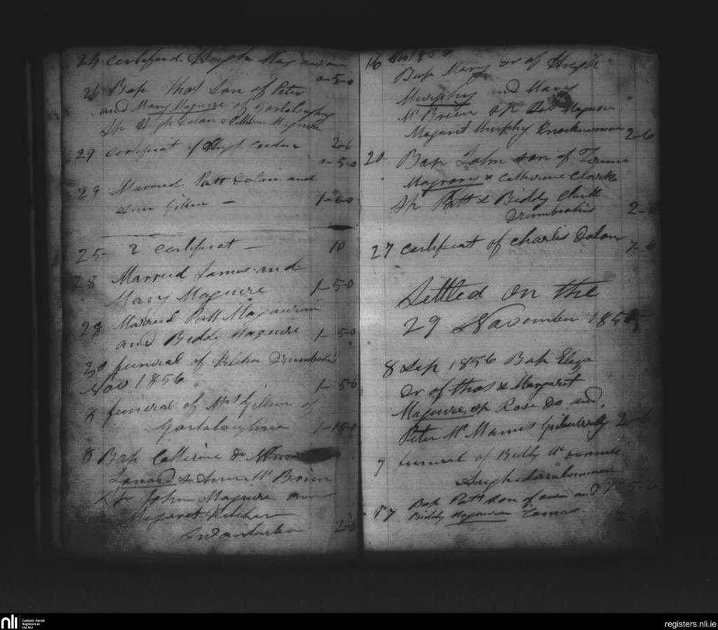 Kinnally; County of Fermanagh, Cavan; Diocese of Kilmore. Baptisms, Marriages, Funerals, Sep. 1856 to Nov. 1856