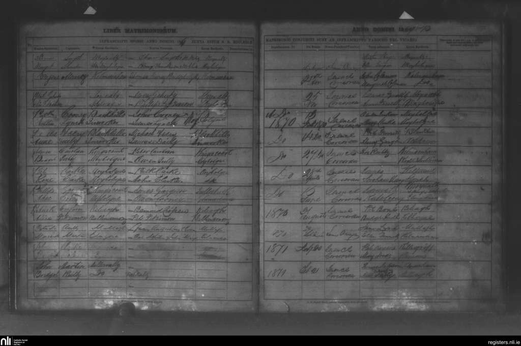 Moybologue; County of Cavan, Meath; Diocese of Kilmore. Marriages, Aug. 1869 to Feb. 1871