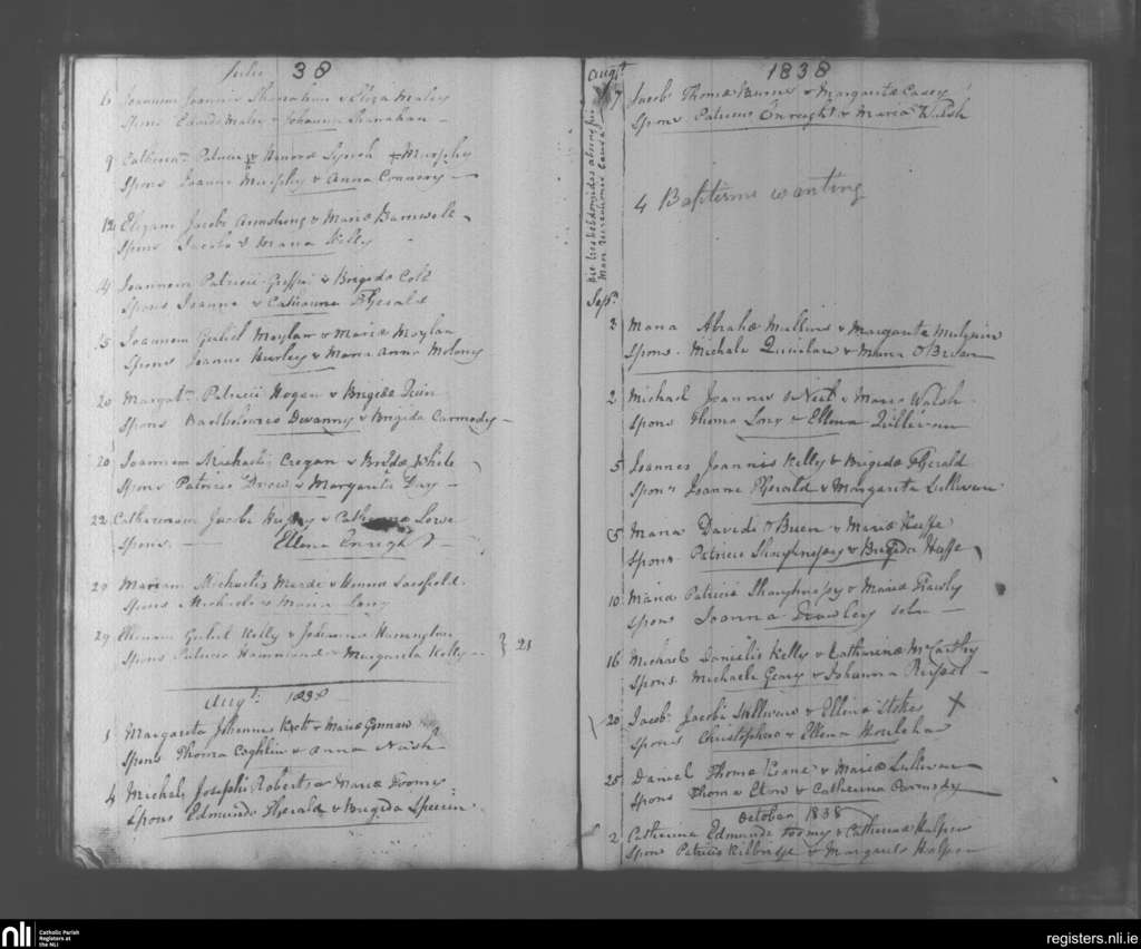 Adare; County of Limerick; Diocese of Limerick. Baptisms, July 1838 to Oct. 1838