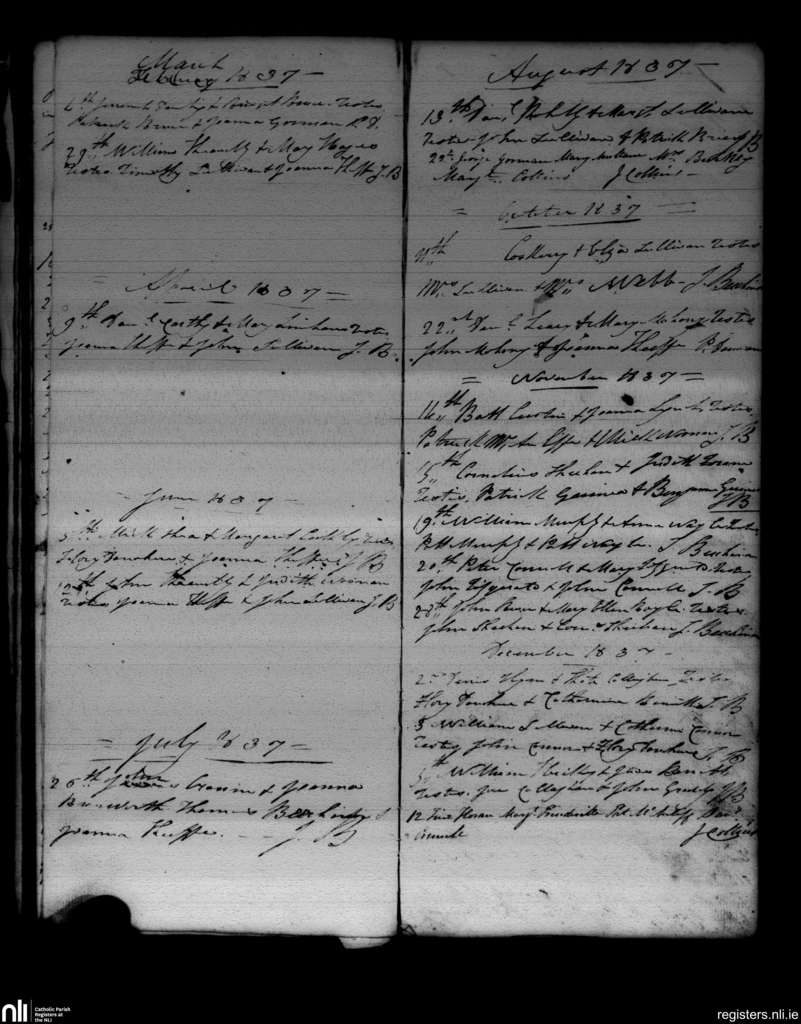 Newmarket; County of Cork; Diocese of Cloyne. Marriages, Mar. 1837 to Dec. 1837