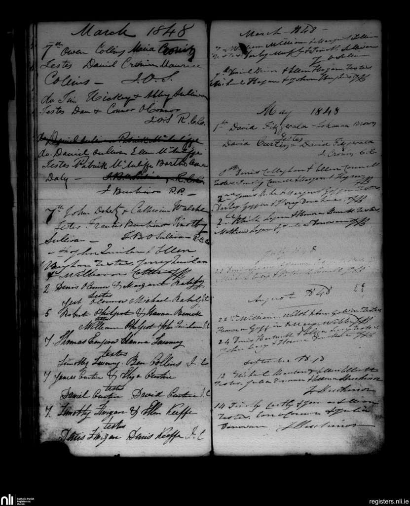 Newmarket; County of Cork; Diocese of Cloyne. Marriages, Mar. 1848 to Sep. 1848