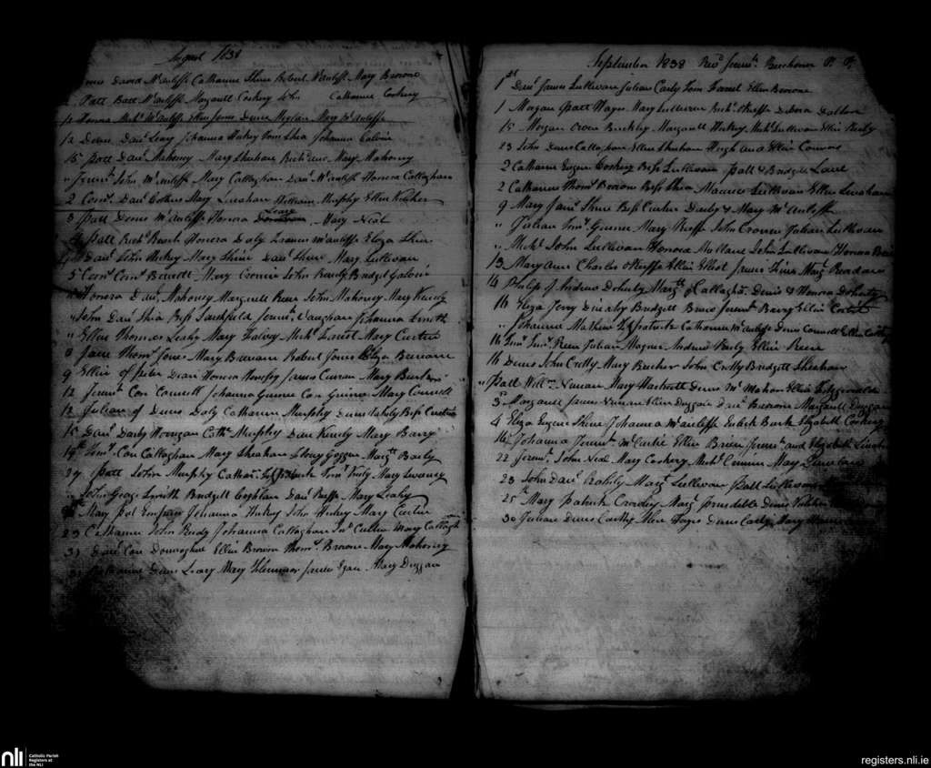 Newmarket; County of Cork; Diocese of Cloyne. Baptisms, Aug. 1838 to Sep. 1838