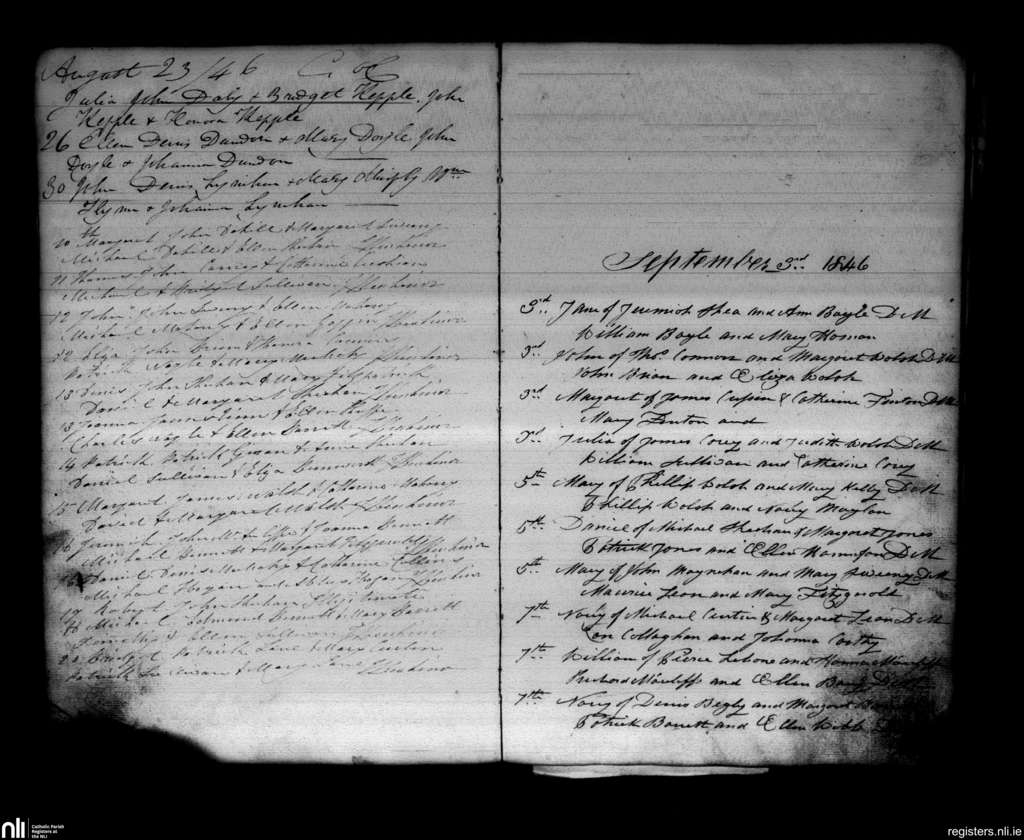 Newmarket; County of Cork; Diocese of Cloyne. Baptisms, Aug. 1846 to Sep. 1846